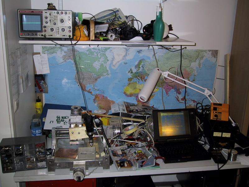 | Here is my general setup. In up, there is oscilloscope which is very handy thing when analyzing steps generated by PC or by controllers. A small laptop PC runs EMC and small 32A variable voltage (2-16V) power supply feeds all of my electronics. | |