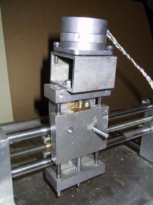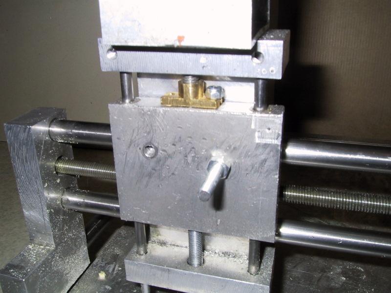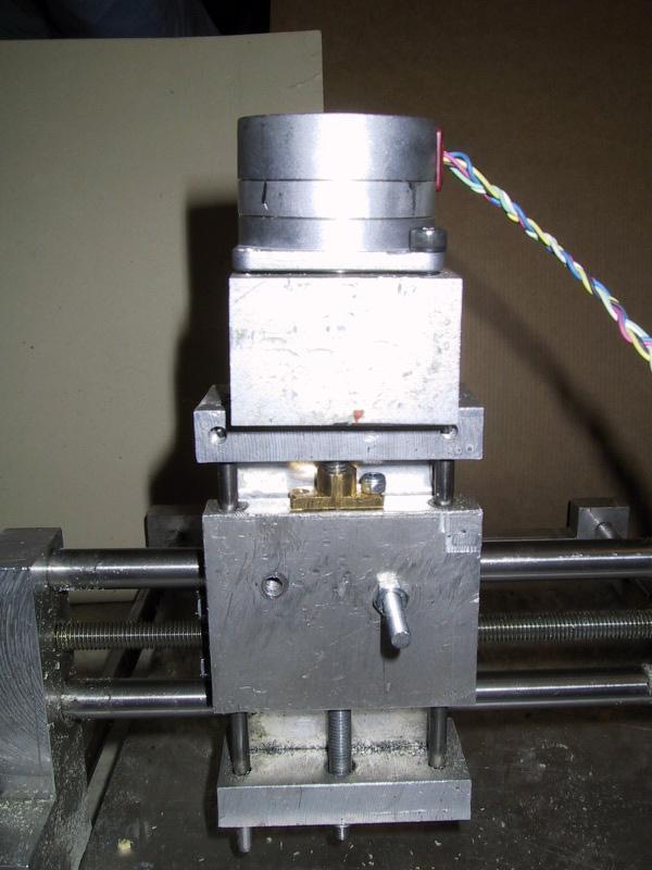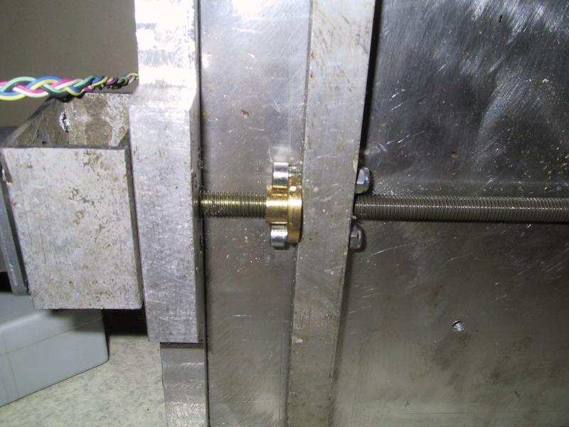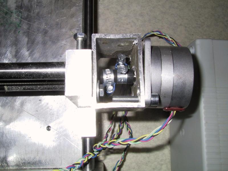 | Holder is a aluminium "tube" cutted to right lenght and drilled with proper holes to make axis go through and to fit motor. Holder also has 2 screws for attaching to machine itself, and these screwsholes are loose enough to allow proper adjustement to align axis to motor shaft. The motor shaft and screw axels are attached with rubber tube tightened with "water pipe tighteners". This allows small movements and eliminates vibrations translating to axel. | |